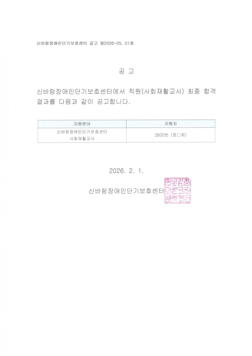 2026년 신바람장애인단기보호센터 직원 채용 결과 공고 페이지 정보 작성자 유명호 작성일26-01-31 17:02 조회9회 댓글0건 관련링크 다음글 목록 답변 본문 채용결과 다음글 목록 답변
